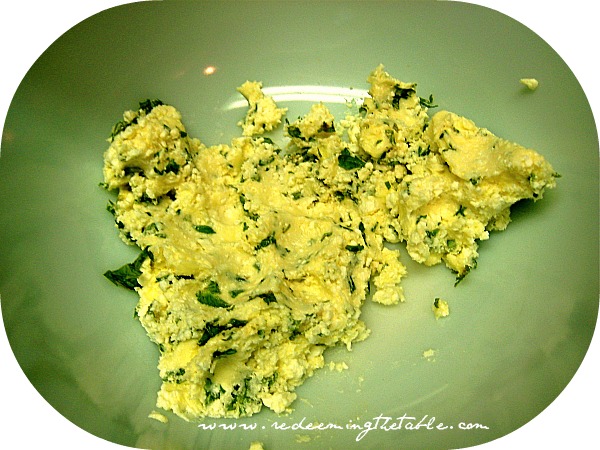 While we were at the cabin last week I came across this recipe in my Gourmet magazine and thought it would be nice to branch outside of the typical butter & salt. Plus, I had this wonderful feta cheese from the Farmer’s Market and some fresh mint from my house. And I must say it was wonderful!