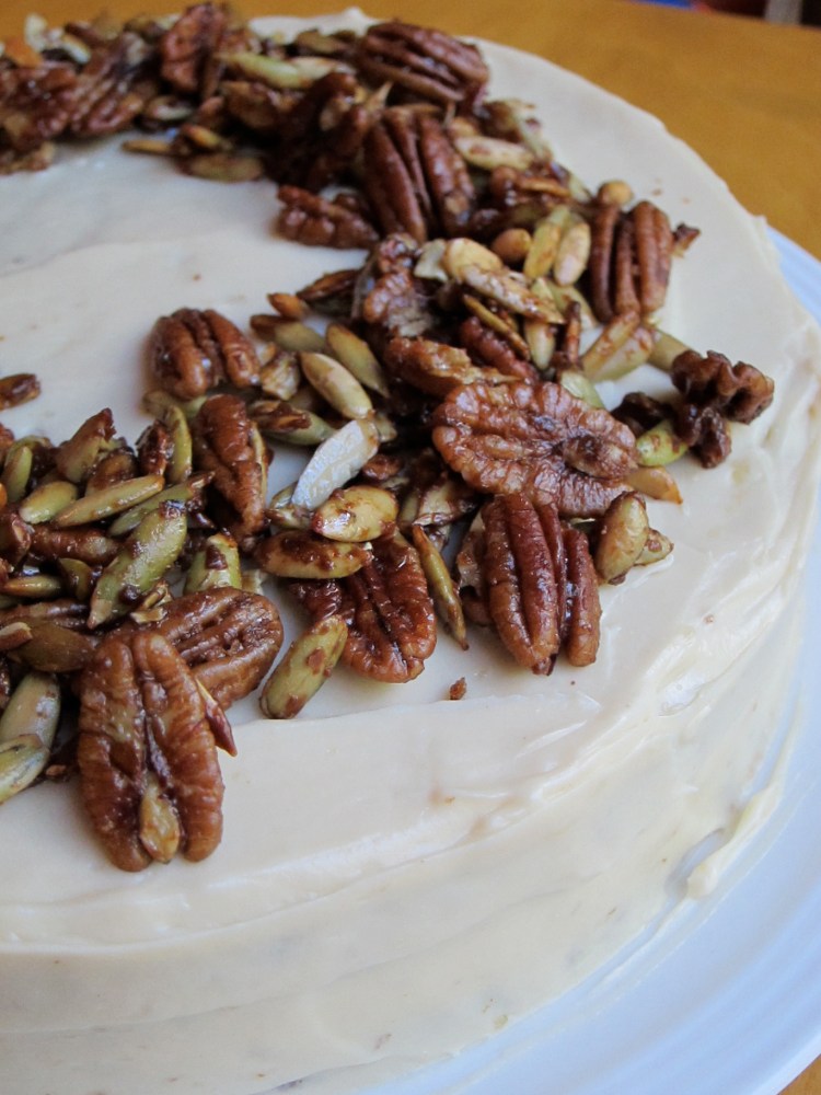 Assemblage: Get a large cake plate and place one cooled cake top side down. Spread about 1/2 -2/3 cup of frosting on the cake. Take your other cake and place it top side down. Frost the top and sides with remaining frosting. Top the cake with glazed nut/seed topping. Serve immediately. **If you’d like, you could take 1/2 cup of the nut mixture and sprinkle it over the first layer of frosting to sandwich it between the two layers. Then, use the remainder for the top.