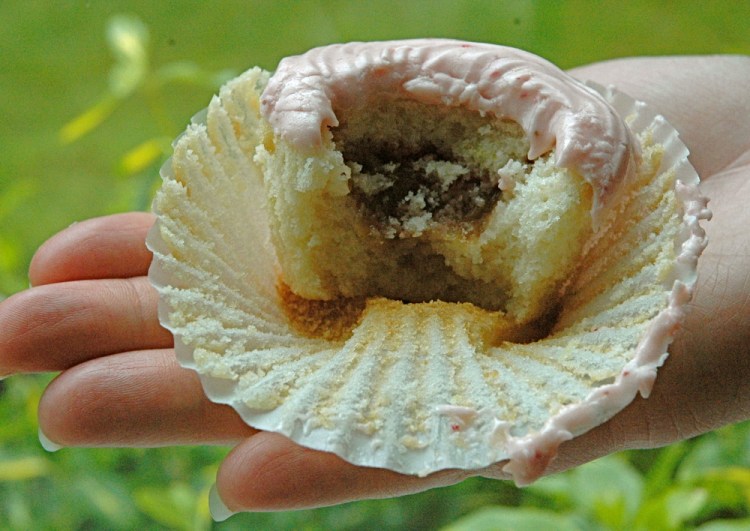 Rhubarb-Strawberry filled Lime Cupcakes