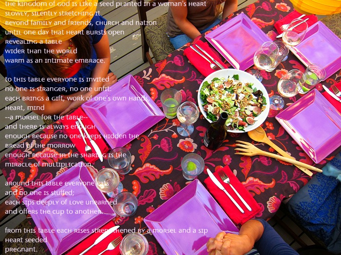 My heart feels like it could explode. This poem is in one of the books I got, New Testament Hospitality by John Koenig. It was written by his friend, Sister Marilyn Robinson. Her words could not be any more poignant or true of what I picture as a slice of heaven & friendship around the Table.