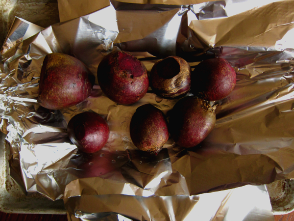 Preheat oven to 400. Take your beets and scrub them clean. Using a paring knife, cut off the tips if they’re really long and the stem end. Take aluminum foil and put your raw, clean beets inside and wrap them up (completely sealed) in the foil. Place on a baking sheet to avoid dripping, and roast for an hour.