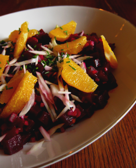 Take two of your orange slices or segments and squeeze the juice into the vinaigrette bowl. Stir everything together. Pour the vinaigrette over the beets, mixing thoroughly and allow it to sit for 30 minutes to 4 hours (the longer the better). Cover and put in fridge.