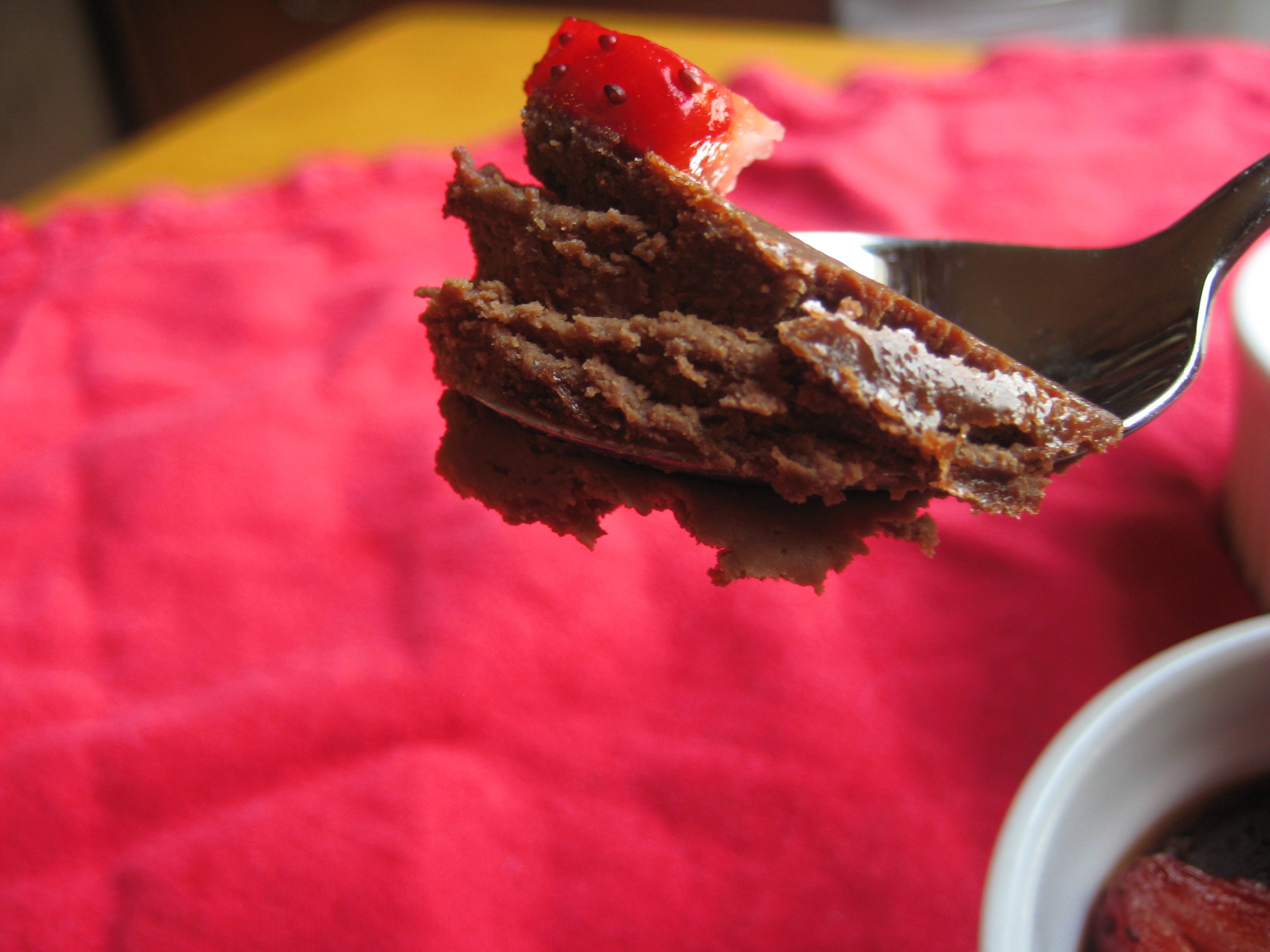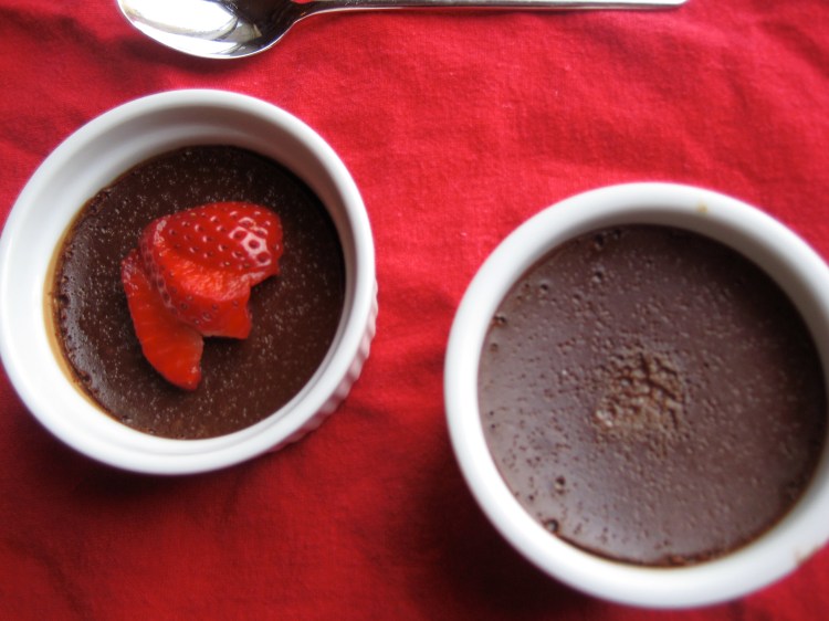 This recipe has been adapted from Smitten Kitchen’s Chocolate Souffle Cupcakes, which had a mint topping and used espresso powder instead of the actual espresso I used in mine. You should do as Deb over at Smitten Kitchen says, “eat at once,” because the coolness of the Raspberry Cream enhances the dessert.
