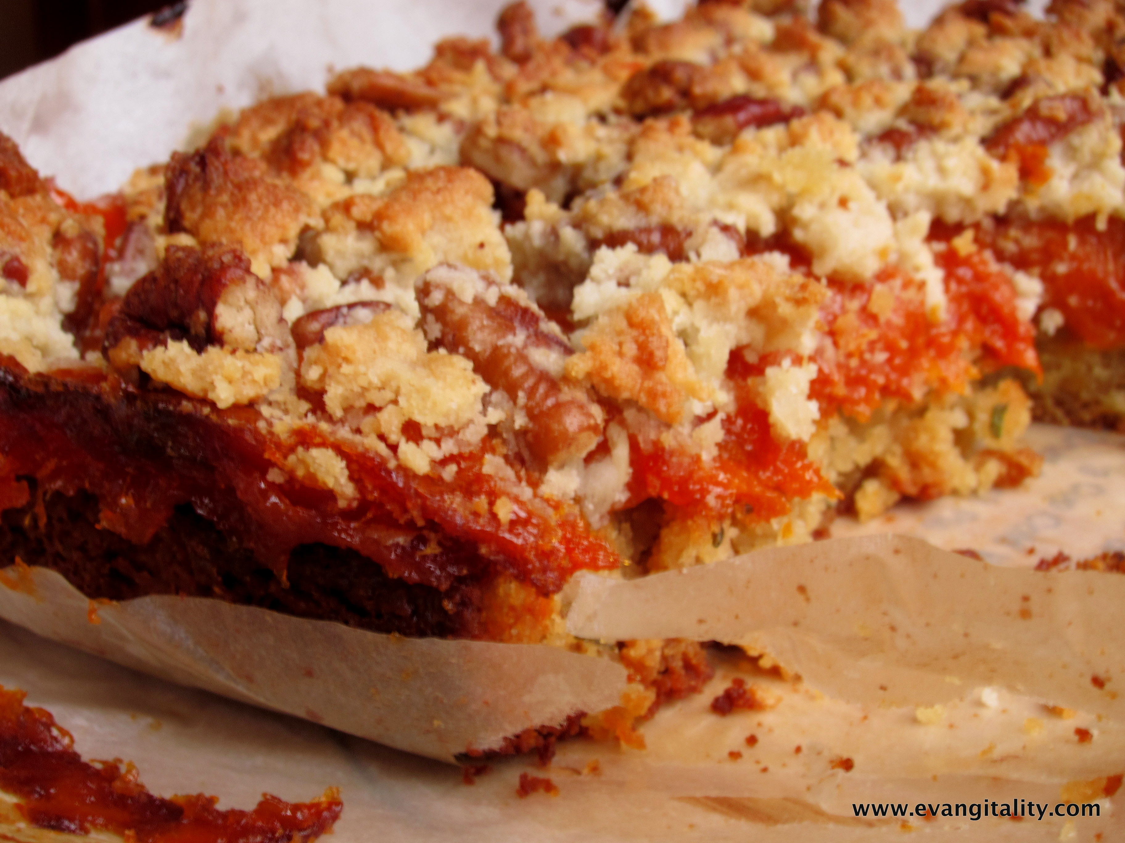 This recipe is inspired from Baked Explorations by Matt Lewis and Renato Poliafito. I have revamped quite a bit from the original; however, the spirit of the original is still fully in this recipe. I used Honeyville Blanched Almond flour. I also used California dried apricots and not the typical, sweeter ones you find, which are a product of Turkey. Opt out of the product of Turkey and find the California ones, which are a bit more tart and a beautiful, bright orange (Trader Joes carries them). Also, I don’t have a dilemma in using real butter; yet, I chose to do half coconut oil & butter. Another fat option for the shortbread might be olive oil. If you are wanting to make this without the egg yolk–it would be fine.