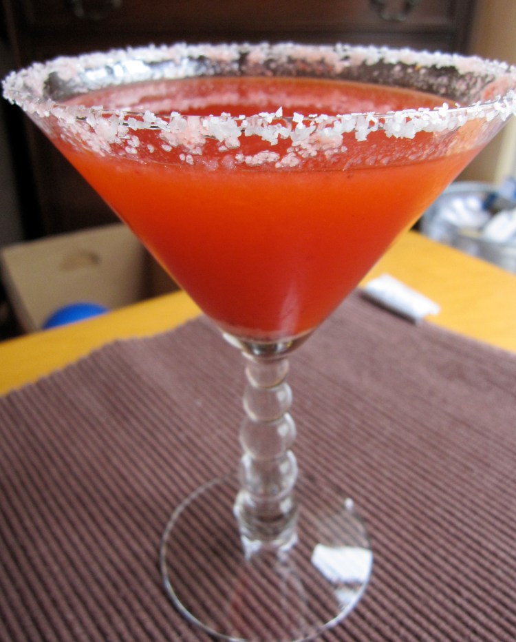In a measuring cup, combine lime, sugar, and water. Set aside. In another measuring cup, measure out tequila & strawberry puree–mix. Prepare two martini or margarita glasses by rubbing lime around the rim, then dip them in a dish of coarse salt. Pour limeade mixture & liquor mixture into a shaker, add ice & shake for 10-15 seconds. Pour the margarita into prepared glasses. Serves 2 large margaritas or 3 small.