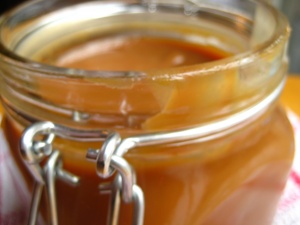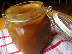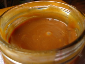 This recipe is from Fine Cooking Winter 2004 issue. I cook mine in my dutch oven to ensure it doesn’t burn. Making caramel is more about color and temperature than about time. The original recipe says it takes “about” 28 minutes to get to the right color. But, what you need to do is stay right by the stove while it cooks, because it can go from just ready to burnt in no time. Make this when you have peace & quiet without disturbances–you’ll feel better when you’re licking the spoon and no one is watching.