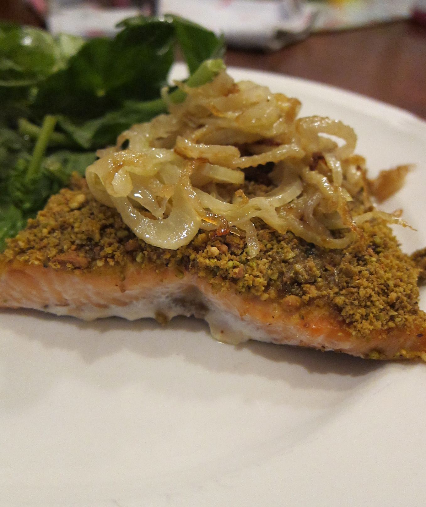 Pistachio Crusted Salmon with sautéed Shallot & Fennel (printable recipe)