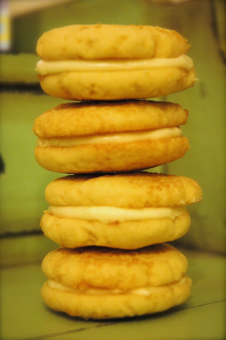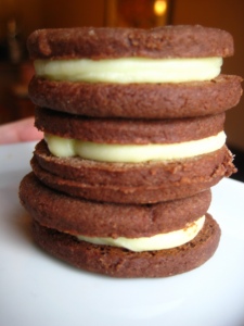 Before I tell you about these wonderful little gems, let me digress. I have this little dream of opening a bakery. It’s a fantasy really, because in reality I know I will most likely not ever do it. The realism side in me shines brightly during these visions of grandeur. I see the long hours, the upfront costs and the early morning hours. So, someone else with the will can go ahead of me and follow their dream. However, if I did open a shop that I truly believe would succeed, it would be a Sandwich Cookie Bakery Shop. Cupcakes are so seven years ago, but cookies in sandwich form are going to be popping up. I’m convinced of it. If you stroll around the blogosphere, it’s all about the “whoopie pie,” which people loosely tie with what I deem as the coveted Sandwich Cookie.