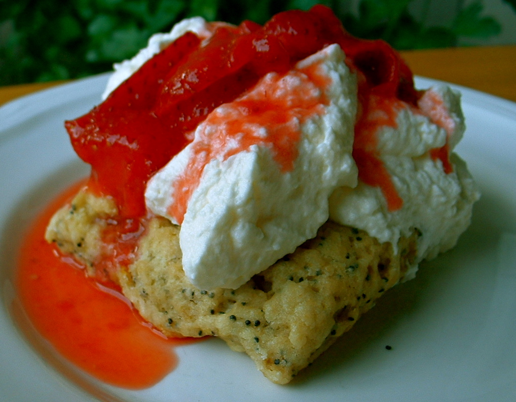 This recipe is from Fine Cooking magazine. You can easily make these shortcakes as plain, by omitting the poppy seeds & lemon juice, and using 1 1/2 cups of heavy cream instead. Another option for the lemon poppy seed shortcakes is by using half strawberries & the other half blueberries.