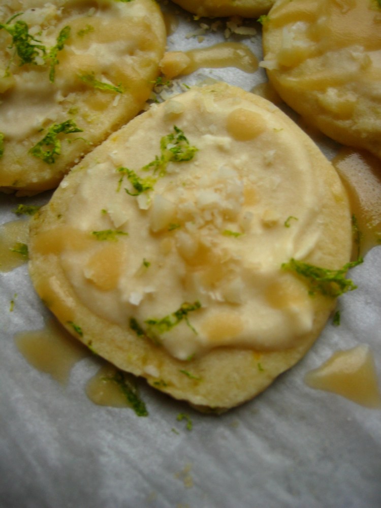 With a spoon, put about 1/2 teaspoon icing on each cookie & swirl around. Drizzle caramel over the cookies with a fork or spoon. Sprinkle with remaining chopped macadamia nut & lime zest.