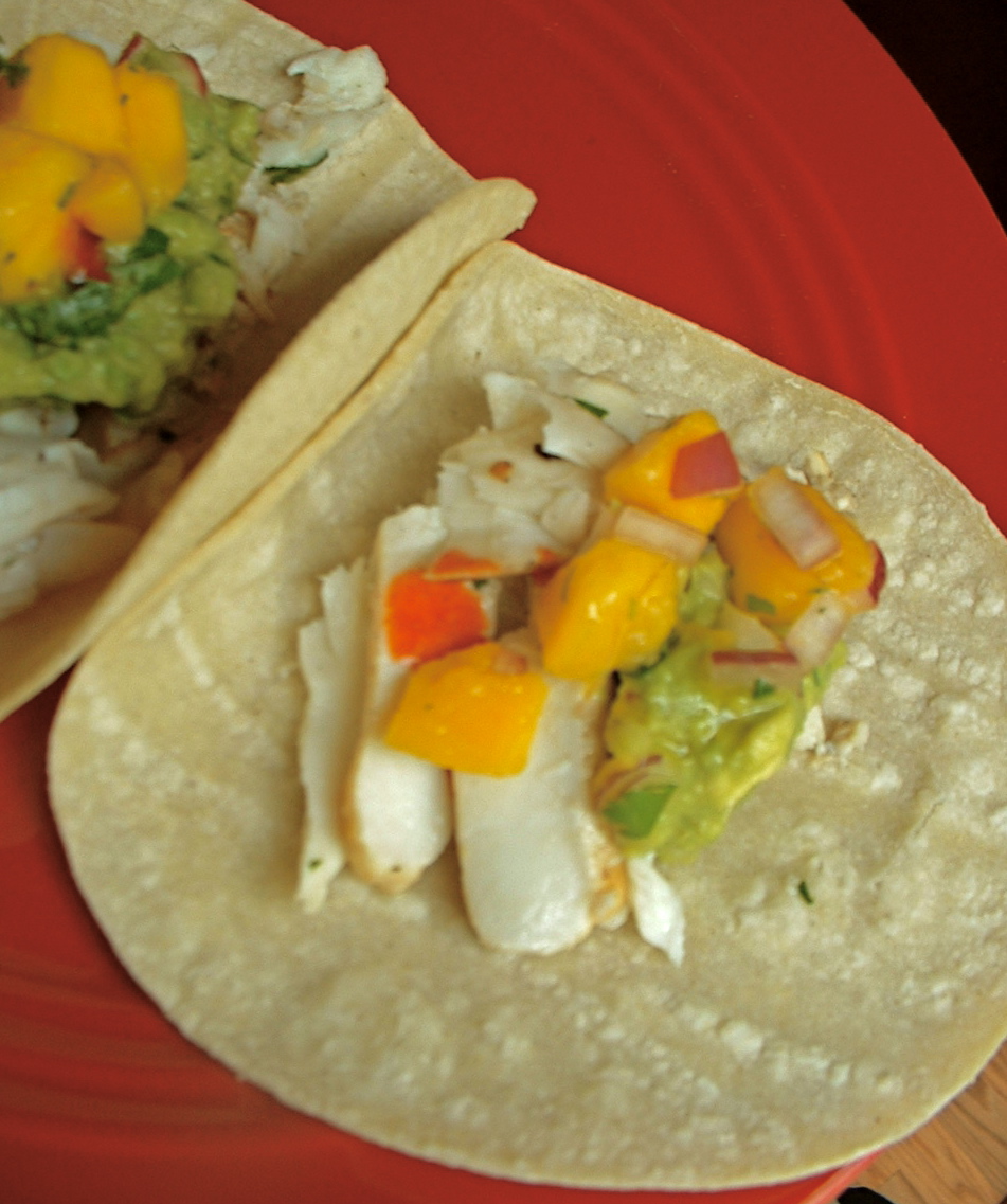 While the halibut is marinading, make guacamole & mango topping. Add avocado to a medium bowl, along with onions & radishes. Mash up the avocado, while leaving a bit of chunks intact. Add lime juice from 1/2 a lime and taste. Add more lime juice if need be. Add kosher salt (about 1 – 1 1/2 tsp), cilantro & jalapeno or Tapatio sauce. Cut mangoes and put in a bowl. Add the onion, cilantro & pinch of salt. Combine the ingredients. Take your warmed tortilla, put about 1/4 cup of halibut on top, 1-2 Tb guacamole & just a bit of mango. When it’s all together it’s a dance party in your mouth.