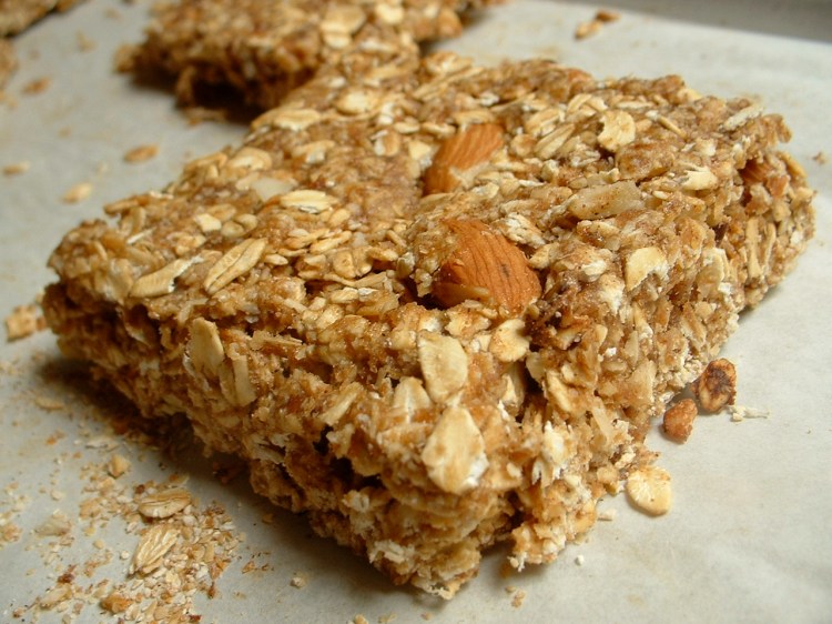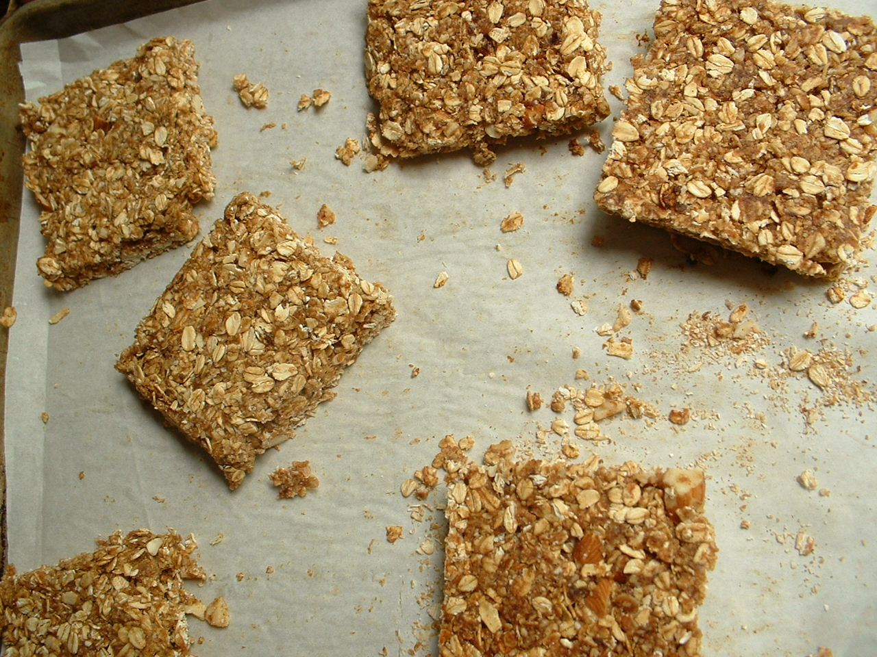 These are great to tie you over and quite filling. If you’re vegan, then try using maple syrup or agave nectar. If you have a peanut/tree nut allergy, you could always use sunbutter.Ingredients: 5 – 6 cups; 17.5 – 21 oz; 500-600 grams rolled oats 2 1/4 cups; 8 1/2 oz; 236 grams medjool dates (seeds out) 1/2 cup hot water 1 cup; 8 oz; 226 grams natural smooth peanut butter 1/2 cup; 6 oz; 170 grams honey 3/4 cup; 3.5 oz; 100 grams almonds 1/2 cup; 2.5 oz; 65 grams oat bran 1/4 cup; 1.25 oz; 34 grams whole wheat flour 2 tsp cinnamon 1 1/2 tsp pure vanilla extract 1 tsp kosher salt Directions: Soak your pitted dates in a bowl with the hot water and cover with a plate for about 10 minutes. Drain the water and dump dates into a food processor. Puree it up. You will need to scrap the sides occasionally. Add the peanut butter to the dates and puree again. While the machine is running, add about 1/3 of the honey (save the rest for later). The mixture will clump into a ball and that’s okay. Remove as much of the date mixture into a small bowl–set aside. Put in the almonds and pulse at 3 second intervals until they are coarsely chopped. In a large bowl, combine 5 cups (or 500 g or 17.5 ounces) of rolled oats, leaving the additional 1 cup of oats aside, oat bran, w.w. flour, almonds & salt. Mix it all up. Put the date puree mixture into the rolled oats bowl. Add the vanilla now & using your hands, begin to mix the ingredients altogether. This will take a bit to incorporate the oats into the date puree. You want the oats to be completely bound by the date mixture. Go ahead and add the rest of the honey to help soak more of the oats & bind it all together–mix some more. Line a half sheet pan with parchment paper and press mixture into the pan. You will want them to be about 3/4 inch thick. Bake at 300 degrees for 20 minutes. The underside of the bars will have more of the toasty look. (You can cut them and turn them over & bake for an additional 5 minutes) Cut them into squares (or bars). Serves about 12-15.