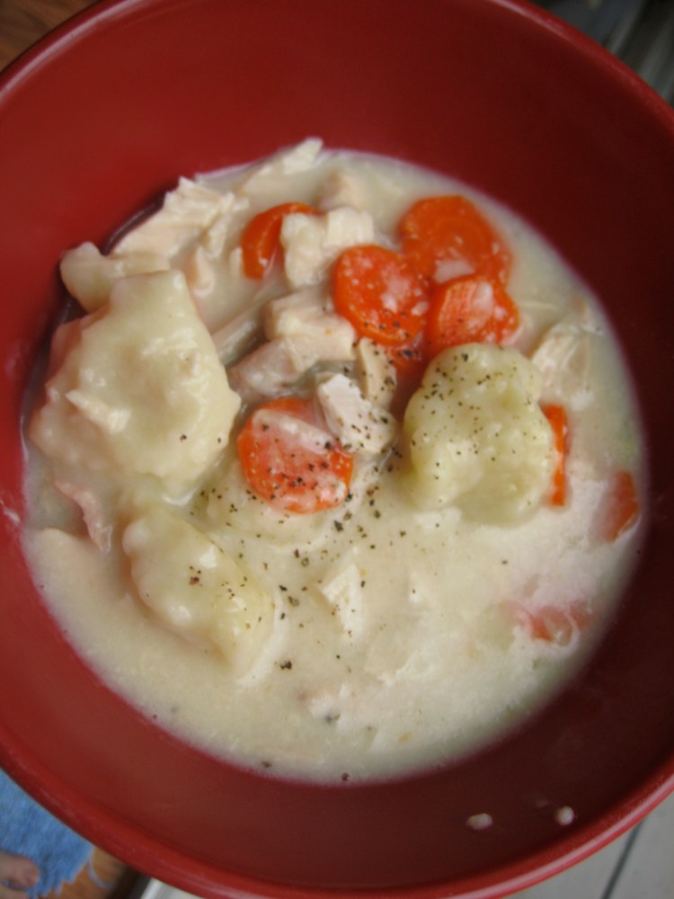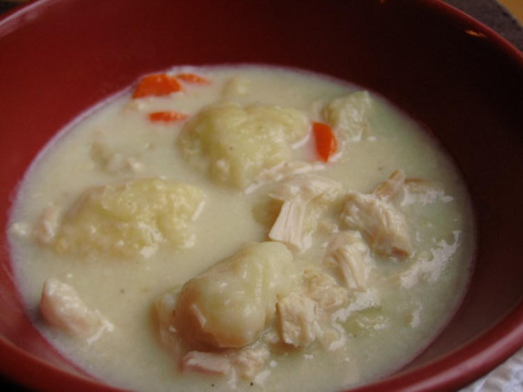 Bringing it altogether: Put the pot of broth on medium-high heat & bring it to a boil, and stir in the milk & pepper. Correct seasonings, if you so desire. Take the dumplings and pinch off 1 1/2-inch pieces, one or two at a time and drop into the boiling broth & reduce the heat to medium-low. Stir from time to time to keep the dumplings from sticking. Continue dropping in the dumplings until there are no more. Cook for 8 to 10 minutes. Add the cut chicken, carrots, & celery to the pot and simmer until heated through. Remove from heat, a couple of grinds with pepper & serve.
