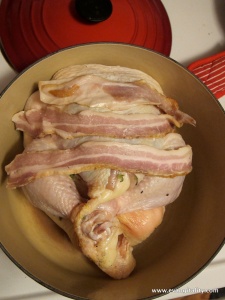 Place the three strips of bacon across the breast and put into the oven, cook for 20-25 minutes. After 20-25 minutes, remove the bacon and turn down the heat to 350. Baste the chicken. Cook for an additional 25-35 minutes, or until a meat thermometer registers 165 (poke it between the drumstick & breast).