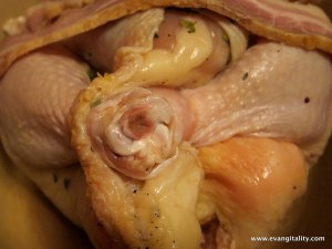 Put the bundle of thyme inside the cavity. Place your whole bird in the dutch oven. By using a dutch oven, you will not have to deal with trussing the chicken. Take the wings and tuck them behind the back of the chicken. Now with a pair of kitchen shears, snip an opening on the fat portion near the birds downside (butt) on both sides, in order to tuck the drumstick ends through the holes (consult picture).