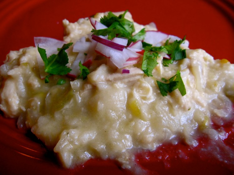 In my rendition of chilaquiles, I’ve used corn tortillas (no frying), a simple green sauce with chicken & cheese. This is one of those so easy, yet so good–you’ll wonder why you’ve been making tacos or enchiladas this whole time. I didn’t make mine very spicy as I only had one can of puree green chilis and who would’ve known that the salsa in the fridge was moldy (it was Organic–I blame it on that). You can easily make it spicier by adding jalapenos, chili flakes or some other tongue burning inducer during the sauce stage.