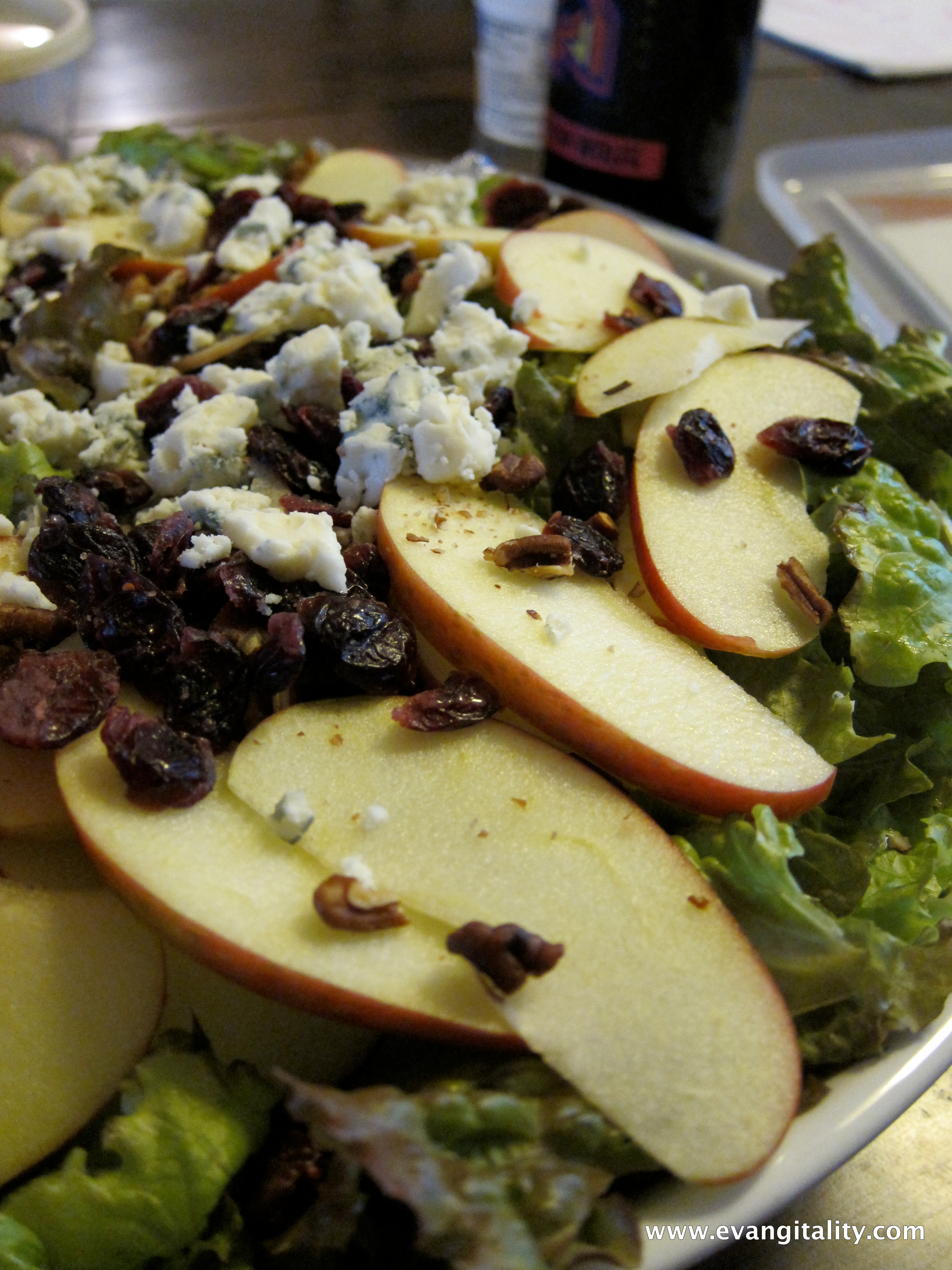 Directions: Pretty straightforward, put the washed/torn lettuce into a big bowl. Sprinkle the nuts, dried cranberries, & blue cheese on the lettuce.